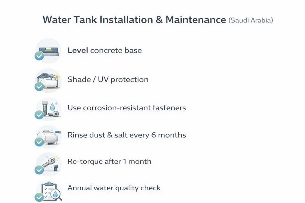 Test stored water annually (pH, total dissolved solids, turbidity, bacterial count). High mineral content or acidity accelerates internal corrosion in steel tanks. FRP tanks are resilient to water quality variations but benefit from annual pH testing to ensure compliance with WHO/Saudi standards.